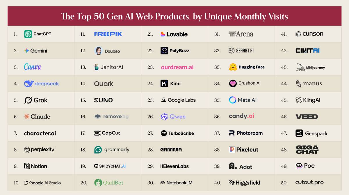 The latest report from Andreessen Horowitz tracks the most widely used generative AI consumer applications based on web traffic and mobile usage data. The ranking includes leading AI platforms such as ChatGPT, alongside emerging tools focused on image generation, coding assistance, productivity, and entertainment.